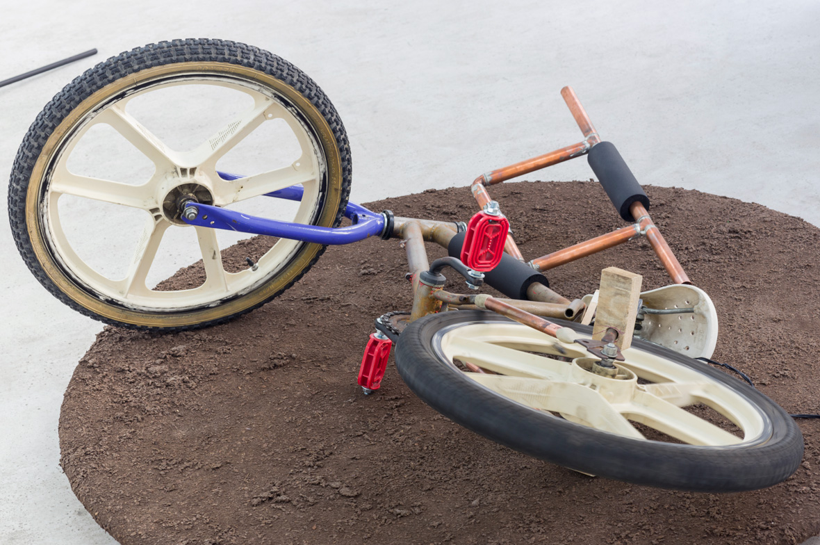 Assemblage de plusieurs vélos, cuivre, moteur de jouet, moquette fausse terre, bois - 2017